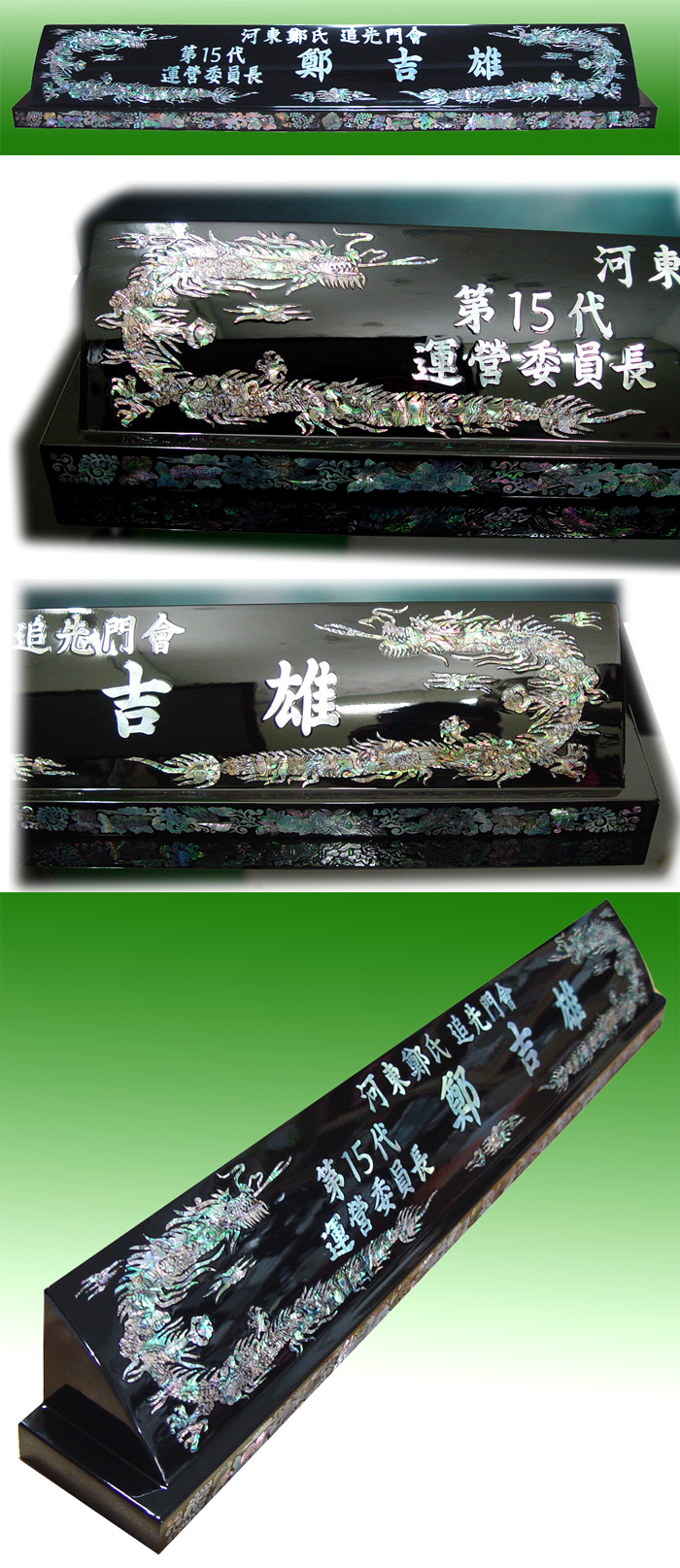 | 용도 | 몸체길이: 80cm<BR>특大용<BR>화려한 용문양이 특징이며<BR>최고의 자리에 최고의 자부심을 드리는<BR>최고 가치의 수공예 자개명패<BR>이 82cm |